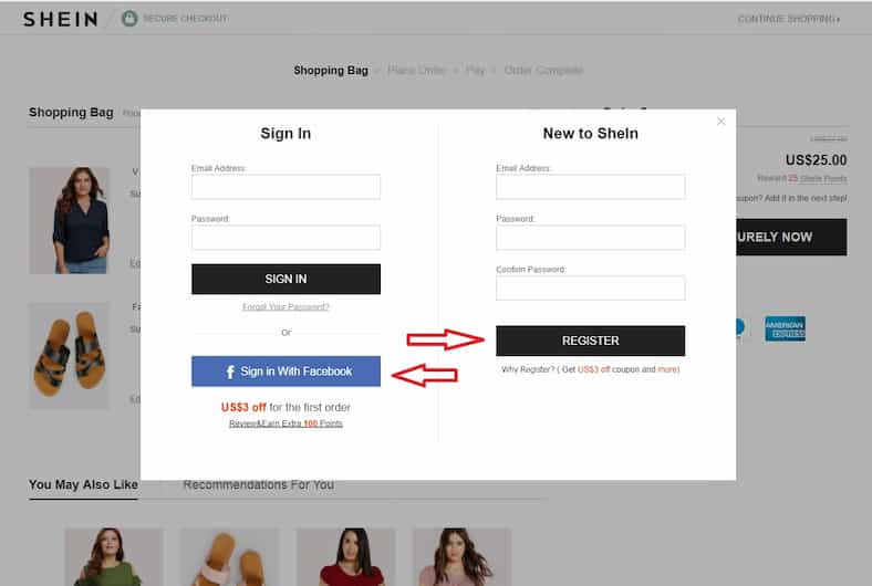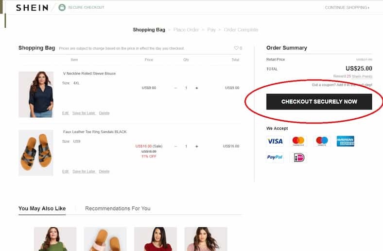 תהליך הקנייה כיפי וקל באתר. כל פריט שמוצא חן בעיניכם ניתן להוסיף בקלות לעגלה, ובסוף לצאת להליך רכישה מהירה. ניתן לקנות עם פיי-פאל, ויזה, מאסטרקארד, אמריקן אקספרס ועוד, כאשר לרוב אפילו אין צורך ליצור חשבון לקוח, אלא ניתן להתחבר במהירות דרך חשבון הפייסבוק שלכם. מי שלא רוצה להתחבר דרך הפייסבוק, תוכל ליצור חשבון במהירות ובקלות. מומלץ תמיד ליצור חשבון משום ש- Shein מציעים צבירת נקודות על כל רכישה. כל קנייה תצבור לכם נקודות בערך שלה, ובהן תוכלו להשתמש כהנחות בקנייה הבאה. כל דולר שתבזבזו שווה נקודת Shein אחת.