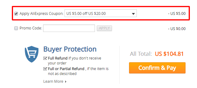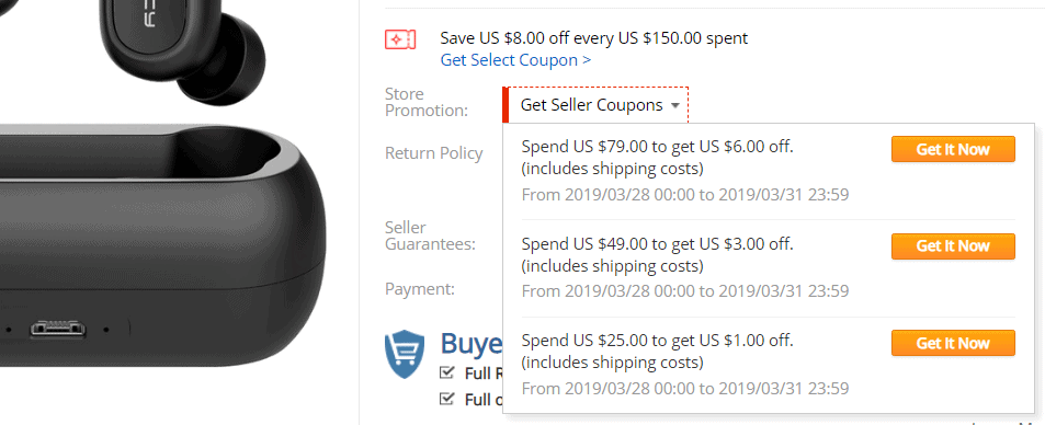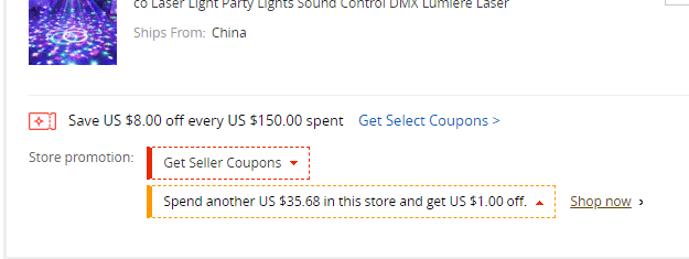 האתר יציג לכם מתחת לכל מוצר אם קיימת אפשרות להשתמש בקופונים מסוג seller או selected (קופונים מסוג AliExpress תמיד תקפים על כל ההזמנה).