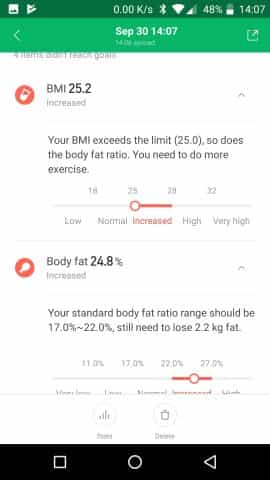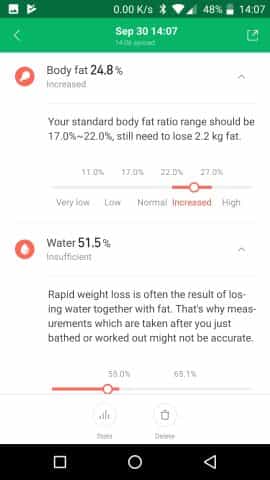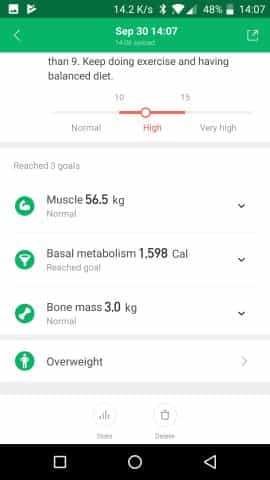 - אחוז שומן – זה המדד העיקרי שמעניין אותי אישית, אפשר לראות שאני נמצא בחריגה 🙁 עם אחוז שומן מעט מעל הגבול העליון. אגב, לא צריך להבין בזה יותר מידי, האפליקציה עצמה אומרת לך אם אתה בתחום הנורמה או לא. לי יש 24.8% שומן בעוד שגבר בגילי צריך רצוי שיהיה מתחת ל22%. עכשיו, נכון שהמדד הרשמי מדליק נורה אדומה רק כשעוברים את 25% אבל הרי ברפואה אין מספרים מדוייקים, מישהו צריך למתוח את הגבול איפשהו ואני מרגיש פיסית שעברתי את הגבול, אני מרגיש היום הרבה פחות טוב מאשר פעם כשהייתי כמעט 10 קילוגרם פחות ולכן אני נוטה להסכים עם ההערכה היותר מחמירה של שיאומי.