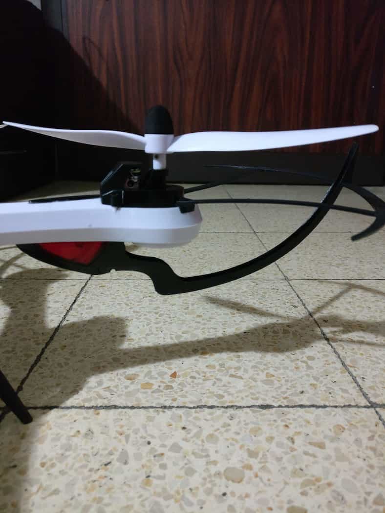 המגנים של הפלופלורים באים כיחידה אחת עם מגיני נורות הלד (בניגוד לרוב הרחפנים שראיתי) ומתחברים עם 4 ברגים. השילוב של מגן פרופלור ומגן לד אומר שיש לשים לב שהנורות הקדמיות כחולות וצריכות כיסוי כחול והאחוריות אדומות וצריכות כיסוי אדום. הרגליות מרגישות צעצועיות עוד יותר ובסיס התמיכה שלהן לא מספיק רחב לדעתי, דבר שגורם לרחפן ליפול על הצד בהרבה מהנחיתות. שימו לב לחבר את הרגליות עם הברגים העבים יותר (שקית שמסמנת בC) אחרת הרגליות לא יחזיקו מעמד בכלל. יש ביוטיוב המון רעיונות איך לשדרג את הרגליות אבל הקונצנזוס הוא שהן צריכות שדרוג.