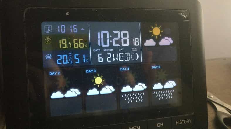 כאמור, למרות שרק חיישן חיצוני אחד כלול באריזה, הצג הזה יכול לתמוך ב3 תחנות חיצוניות, כך שאנחנו יכולים להציג תחנות במקומות שונים מחוץ לבית (במרפסת, במחסן, במלונה של הכלב. יש הרבה מקומות אפשריים) ולקבל מידע על הטמפרטורה ואחוז הלחות. שימושי מאוד ובנוסף, הוא כולל חיישן מובנה המודד גם הוא את הטמפרטורה, הלחות והלחץ הברומטרי בחדר כך שלבסוף אנחנו מקבלים בצד הימיני העליון של המסך את המידע על פנים הבית ומצד שמאל מידע על חוץ הבית (לבחירה בין אחד משלושת התחנות או מצב “מדלג” שעובר כל שלוש שניות בין התחנות השונות).