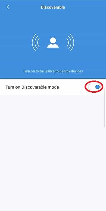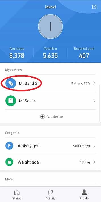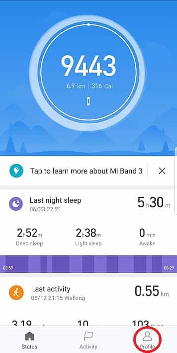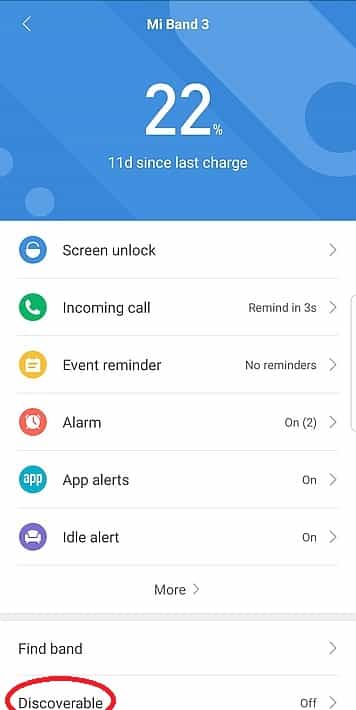 - יש להיכנס לתוכנת ה-MiFit ולהפעיל את ה”נראות” של ה-MiBand למכשירים אחרים. ללחוץ במסך הראשי על כפתור Profile, לבחור ב-Mi Band 3, להיכנס ל-Discoverable ולאפשר אותו.