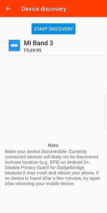 - בתוכנת ה-GadgetBridge שהורדנו והתקנו צריך להוסיף את הרצועה על ידי לחיצה על מקש ה+ כשברשימה נמצא את רצועת ה-MiBand במידה והפעלנו את הנראות לפי הסעיף הקודם. כשנרצה להתחבר לרצועה על הרצועה עצמה תופיע בקשת חיבור שצריך לאשר בכמה לחיצות על המסך. בסיום נוכל לראות את הרצועה מוגדרת בתוך האפליקציה.