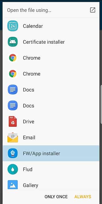 - עכשיו לחלק החשוב, התקנת הקושחה האנגלית. אני מזכיר שוב כי מדובר על תהליך באחריות המשתמש בלבד. נכנסים לסייר הקבצים למקום בו הורדנו את הקובץ (אני משתמש בסייר SOLID), אחרי לחיצה על קובץ ה-fw תיתן האפשרות לבחור איך לפתוח את הקובץ ושם נבחר בתוכנת ה-GadgetBridge כשלאחריה יפתח מסך השואל אם אנו רוצים להתקין את הקושחה מקוסטמת, לוחצים על התקן ומחכים.