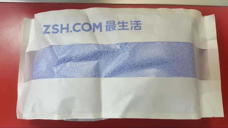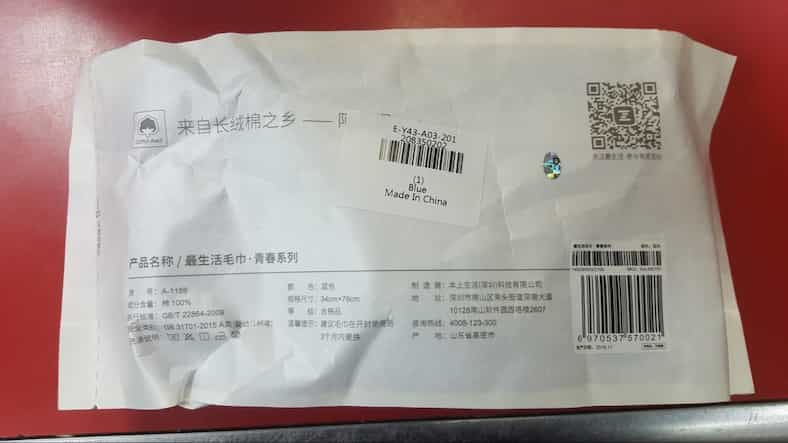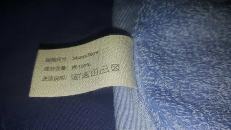 בצד האחורי ניתן למצוא את המפרט הטכני של המגבת (בסינית)