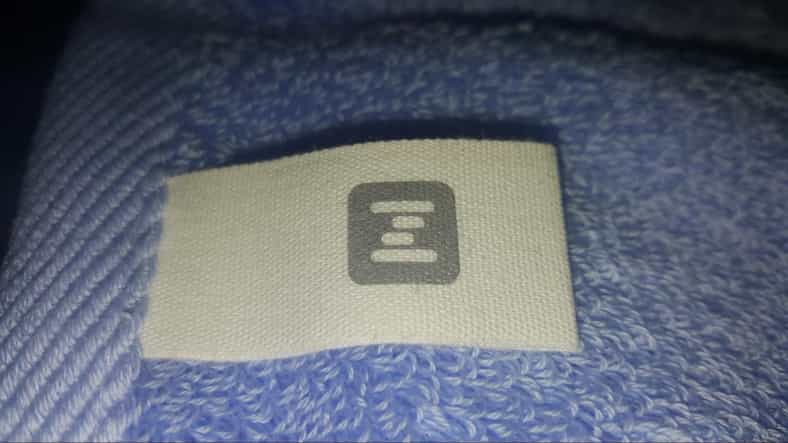 בתגית המגבת ניתן לראות את לוגו החברה ואת המפרט של המגבת : 100% כותנה, כביסה ב30C, לא להלבנה, גיהוץ של עד 110C, ניקוי יבש אסור, ליבוש במצב מאונך.
