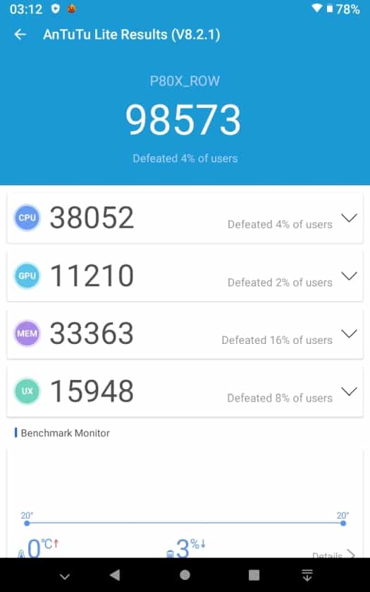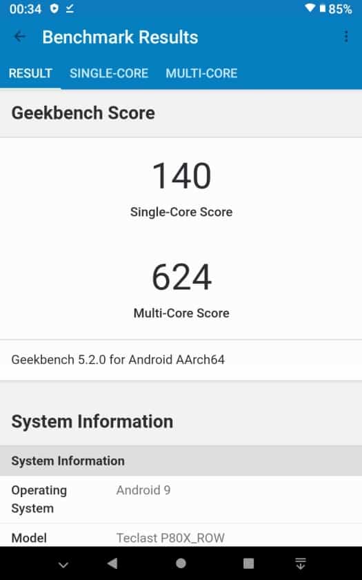 מבחן הביצועים המוכר ביותר אך גם אחד מהשנויים במחלוקת, הוא ה-Antutu או במקרה שלנו ה-Antutu Lite, שנתן תוצאה זהה לגרסה הרגילה של של 98753 נקודת, תוצאה גבוהה בצורה חשודה האמת לעומת ה-70000 אלף הרשמי. בדיקה ב-GeekBench מציגה תוצאה של 624 נקודות לביצועי ליבה בודדת ו-624 לריבוי ליבות כצפוי מ-8 ליבות A55. מלבד זאת נבדק שבב ה-GPS של הטאבלט שמצליח להתאפס על אות GPS בכדקה דקה וחצי, סביר למדי בעבור טאבלט זול.
