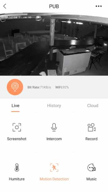 לשונית ה-LIVE מאפשרת גישה לכפתור צילום המסך, שימוש באינטרקום, הקלטת וידיאו, בדיקת הטמפרטורה והלחות (אם חובר החיישן מראש) מתג הפעלת “זיהוי תנועה” וכפתור השמעת מוזיקה ברמקול.