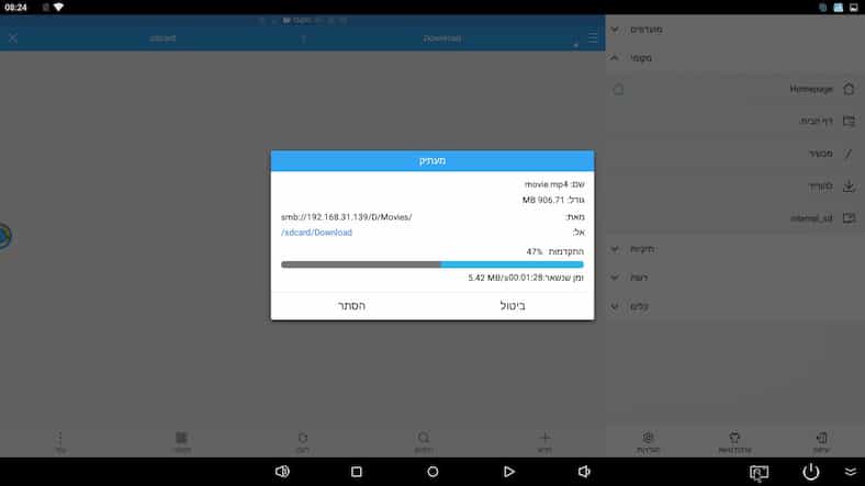 הרבה אנשים לעיתים מאוכזבים מהסטרימר שלהם מפני שהוא לא מעביר נתונים מספיק מהר. אומנם יצרנים תמיד רושמים מהירויות תיאורטיות סופר גבוהות אבל בפועל המשתמש לעיתים רחוקות מקבל את זה. כדי לבדוק במכשיר את יכולת הסטרימינג ברשת האלחוטית שלי עשיתי את המבחן הכי פשוט שאפשר וגם הכי נכון – העתקת קובץ גדול מהמחשב השולחני לזיכרון הפנימי של ה-geekbox דרך חיבור wifi בעזרת אפליקציית ES file explorer. בסופו של דבר הרי הזרמת סרט זה העתקה של קובץ סרט שנמצא במחשב מרוחק, אנחנו צריכים לוודא שהמהירות מספיקה כדי להעביר את הסרט בזמן אמת!