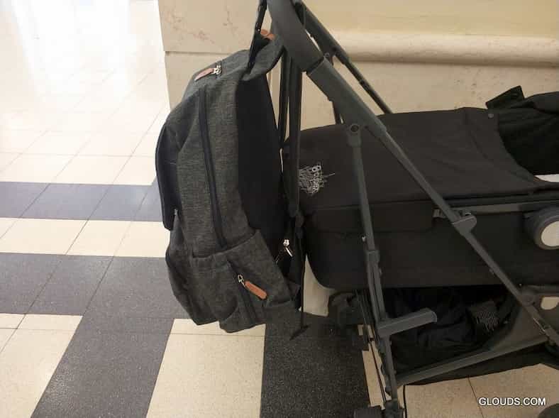 יש קליפסים נוחים לתליה על העגלה – וזה חשוב מאוד – כי רק כך, להבדיל מתיק גב רגיל, מרכז הכובד נמוך יותר וחלוקת המשקל טובה יותר לעגלה ולא גורמת לה להתהפך כשהתיק עמוס.