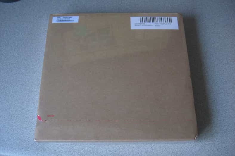 בניגוד לאריזות המלבניות והגבוהות שאנו רגילים לראות, המכשיר מגיע בתור אריזה רב שכבתית, ריבועית ושטוחה, המזכירה מכתב חתום. האריזה החיצונית חומה עם לוגו החברה באדום, כשבצידה האחורי לשונית המחוברת לחוט שיש למשוך כדי לפתוח אותה.