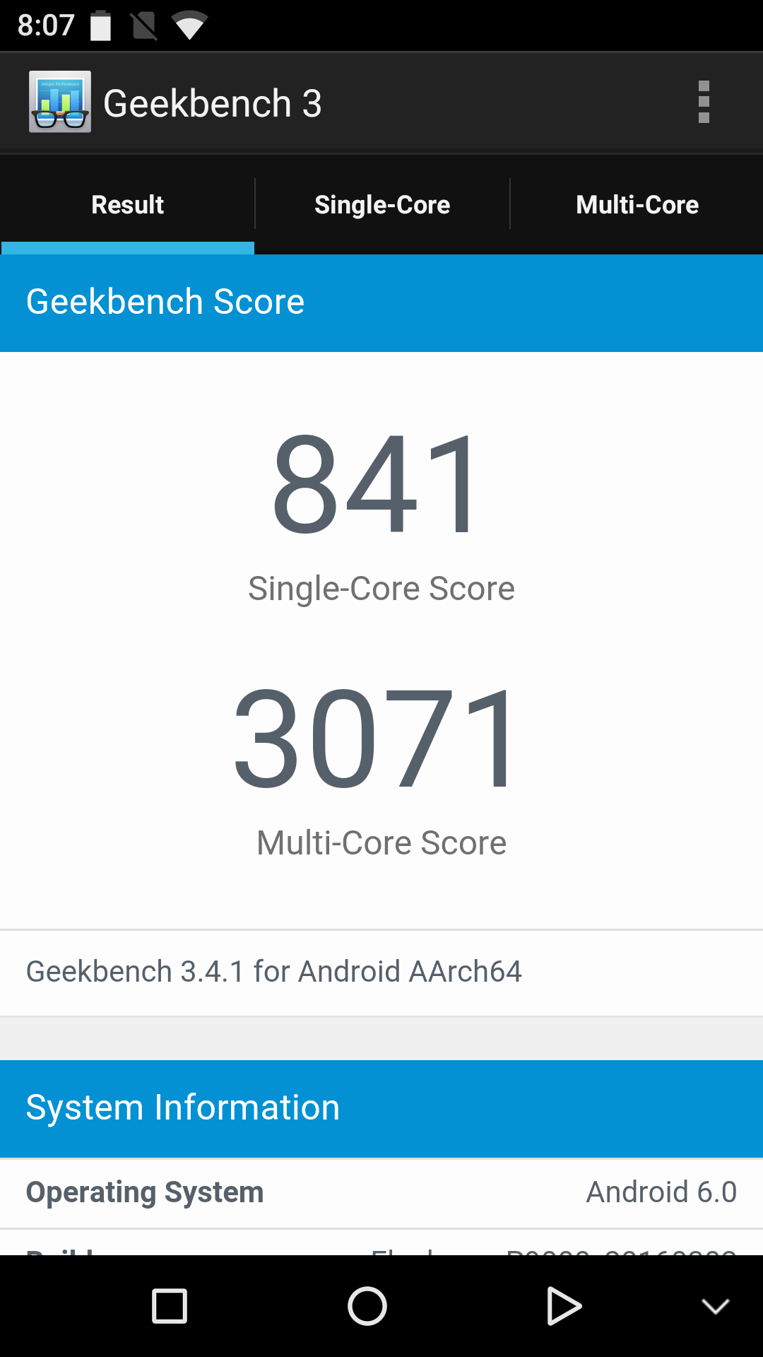 GEEKBENCH – MULTICORE – 3071, SINGLE CORE – 841