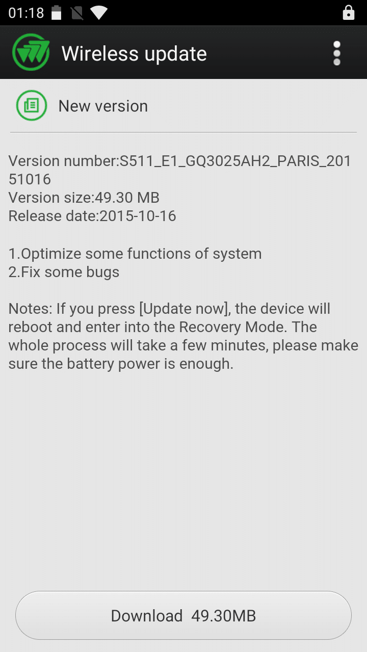 גרסאת האנדרואיד היא 5.1, ויש תמיכה בעדכוני OTA, ואכן בבדיקת עדכונים, הותקן עדכון קטן אוטומטית.