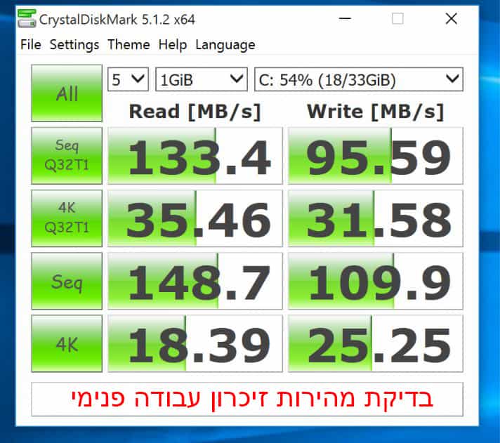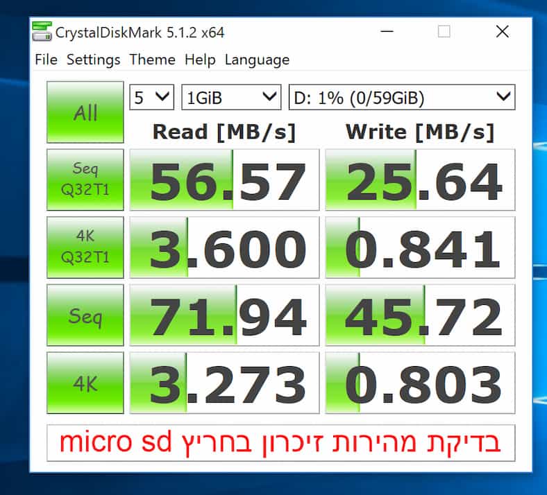 עוד בתחום הזיכרון, ביצעתי מבחן למהירות קריאה/כתיבה לזיכרון הפנימי ולזיכרון שבכרטיס micro sd והתקבלו תוצאות טובות העומדות ברמה שציפיתי לה כאן.