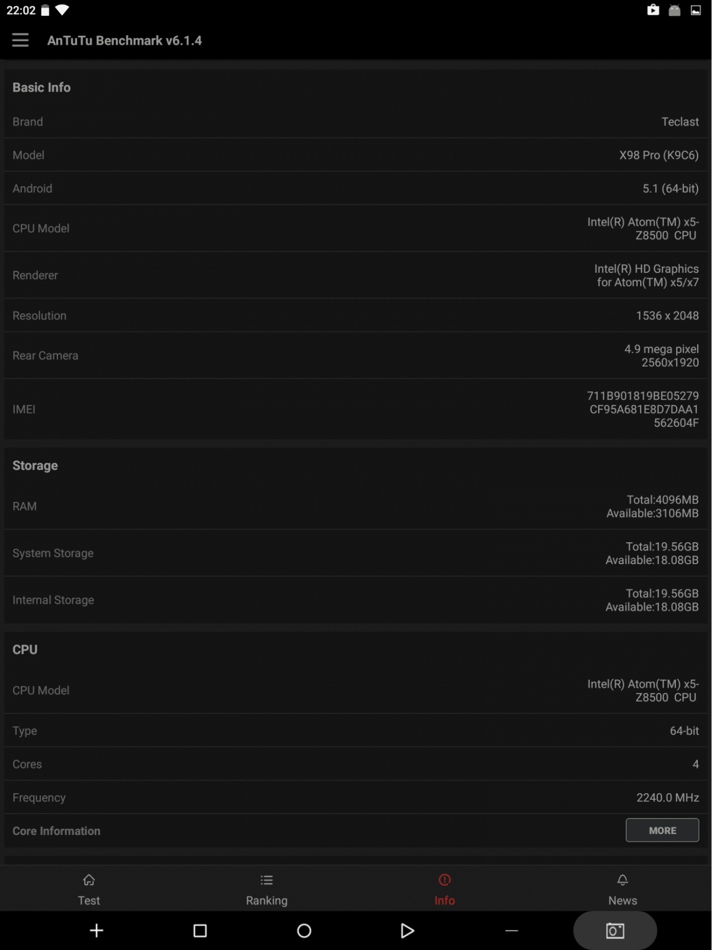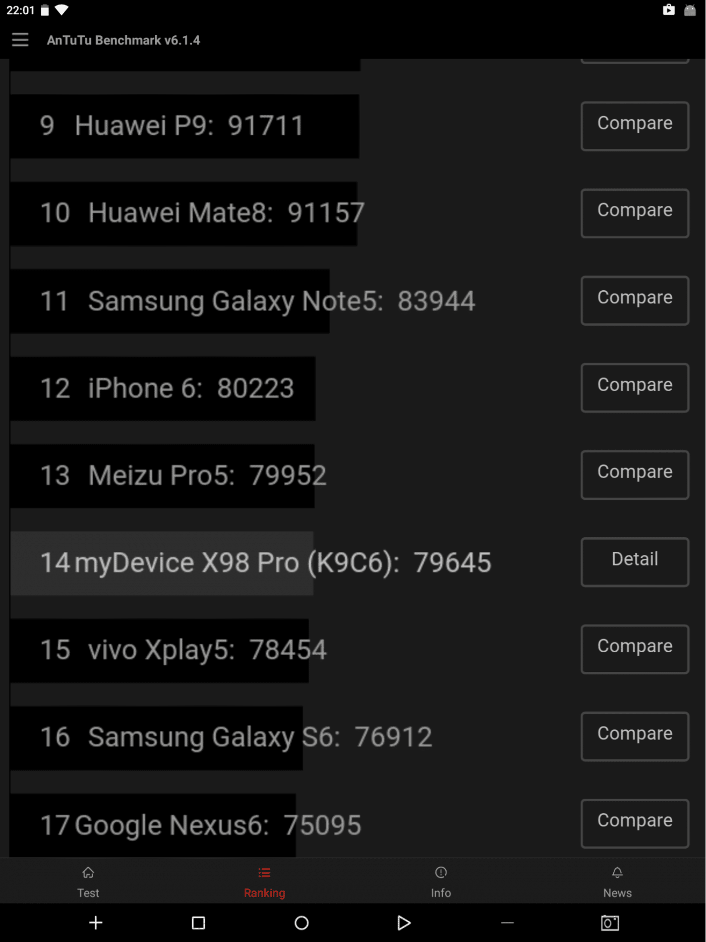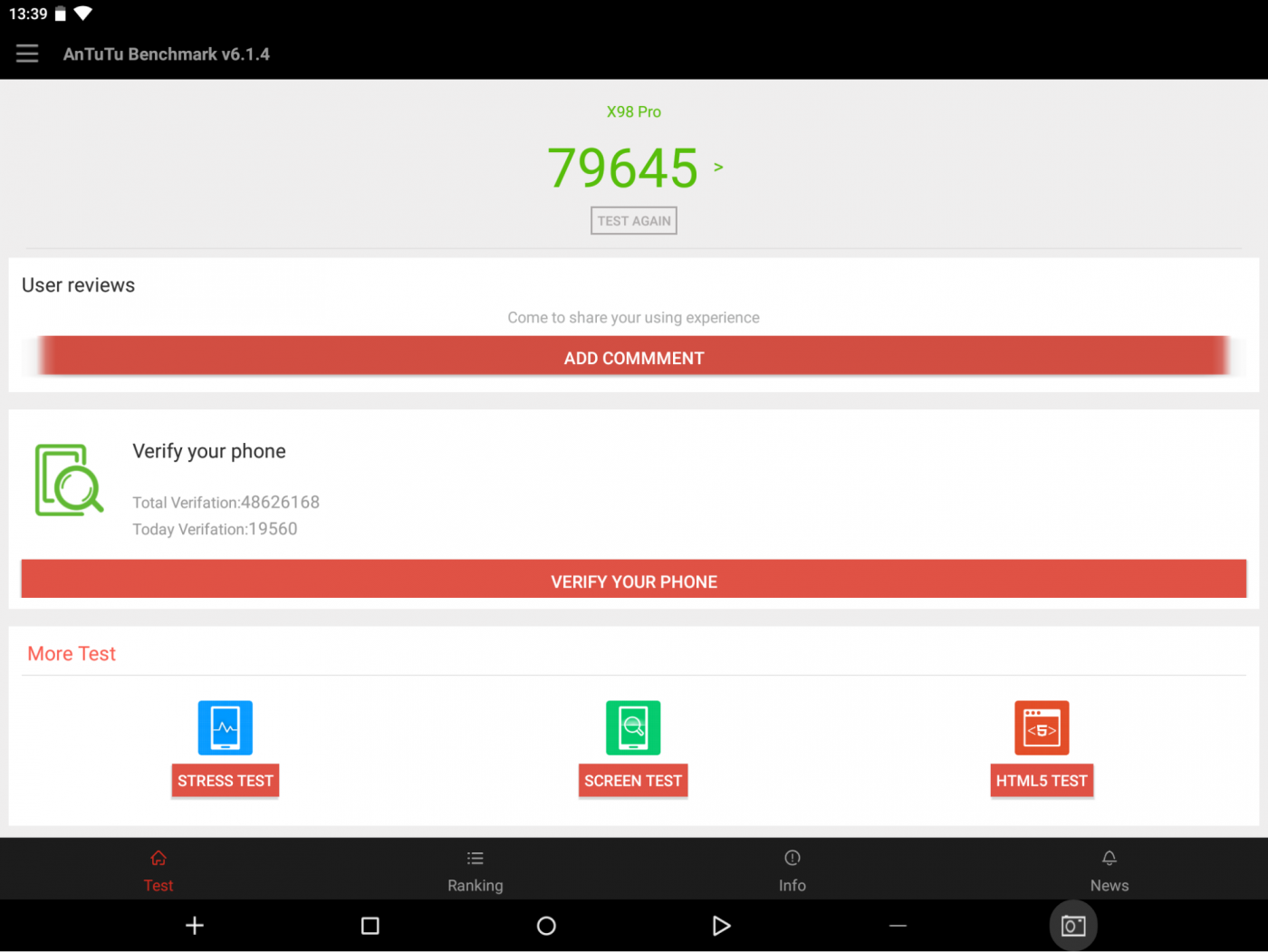גם במבחן הביצועים במערכת אנדרואיד התקבלה תוצאה יפה מאוד וגבוהה מזו של Samsung Galaxy S6. טאבלט surface 3 שלא כמו ה x98pro מגיע רק עם מערכת חלונות ולכן לא ניתן להשוות תוצאה זאת אליו.