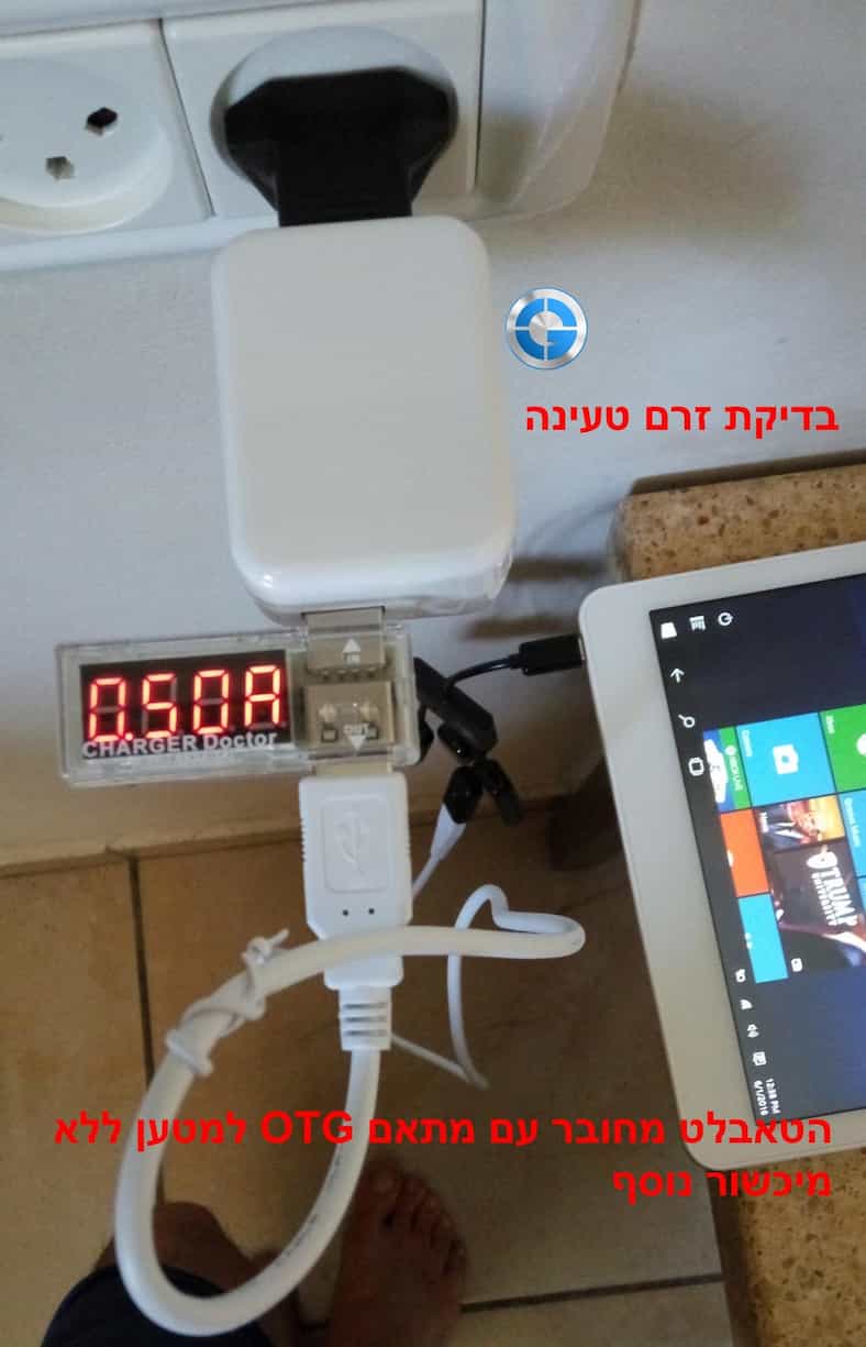 זרם הטעינה של הטאבלט בחיבור ישיר מהמטען אליו הגיע ל 2.36A. זהו זרם שיכול להספיק להטענת הטאבלט גם בזמן עבודה רגילה, במשחקים הוא ישמור מעט על רמת הטעינה הנוכחית. במדידת טעינה שבצעתי בחיבור לטאבלט דרך מתאם ה OTG הזרם ירד משמעותית ועמד על אזור 0.55A. המשמעות של זה היא שרמת הטעינה של הסוללה תדעך למרות החיבור למטען, אך היא תדעך לאט יותר מאשר אם הטאבלט לא יהיה מחובר למטען כלל. אם תכבו את המסך ותחברו את הטאבלט למסך חיצוני באמצעות יציאת ה HDMI שלו הצריכה תקטן משמעותית ויתכן שהזרם הזה בעבודה רגילה יספיק בכדי לשמור על רמת סוללה קבועה פחות או יותר.