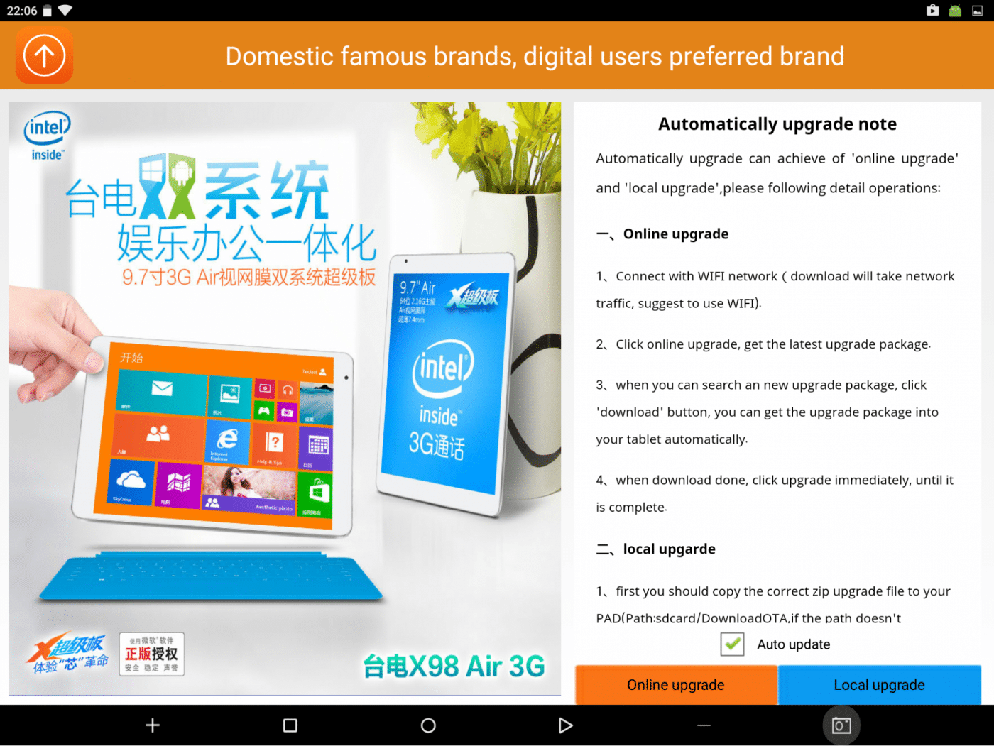 עברית מלאה ניתנת להגדרה פשוטה גם באנדרואיד וגם בחלונות. כשתקבלו דרישה לעדכון מערכת חלונות תאשרו אותה, העדכון גם יאפשר לכם להתקין אפליקציות על כרטיס זיכרון בחריץ הטאבלט. במערכת אנדרואיד ישנה אפליקצית עדכונים של teclast, המלצה שלי: אל תבצעו עדכון כל עוד לא נתקלתם בתקלות בגרסת המערכת הנוכחית כי לרוב זה יהיה מיותר והגרסה החדשה עשויה להביא עימה תקלות משלה. על פי האפליקציה מותקנת בטאבלט גרסת המערכת האחרונה של היצרן.