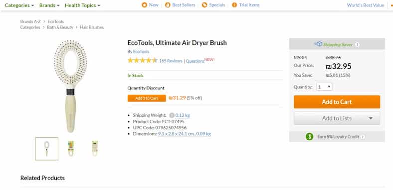 בהזמנה האחרונה שעשיתי מאתר IHERB, חיפשתי מוצר SHIPPING SAVER להוסיף לעגלה כדי להוזיל את המשלוח (כאן תוכלו לקרוא על האתר ועל מה זה מוצרי SHIPPING SAVER) ונתקלתי במקרה במברשת הזו של חברת אקו טולס. שנקראת Ultimate Hair Dryer Brush. את החברה אני מכירה כבר תקופה בשל מברשות האיפור הנהדרות שלהם, אבל אף פעם לא ניסיתי מברשת שיער שלהם. השם שלה סקרן אותי, משום שאני מקפידה לייבש את שיערי אחרי כל חפיפה עם פן, ובמיוחד בחורף. בתיאור, המברשת טוענת שהיא נועדה כדי לעבוד ביחד עם הפן, ולקצר את משך ייבוש השיער בכ-40%, ובכך, גם מקטינה משמעותית את הנזק שנגרם לשיער בשל החשיפה לחום. תשמעו, בין כל ההבטחות שהבטיחו לי מוצרי שיער בעבר, זו אחת ההבטחות הטובות. מכיוון שגם המחיר מתאים וגם היא הוזילה לי את המשלוח, הוספתי אותה לעגלה, בלי הרבה ציפיות.