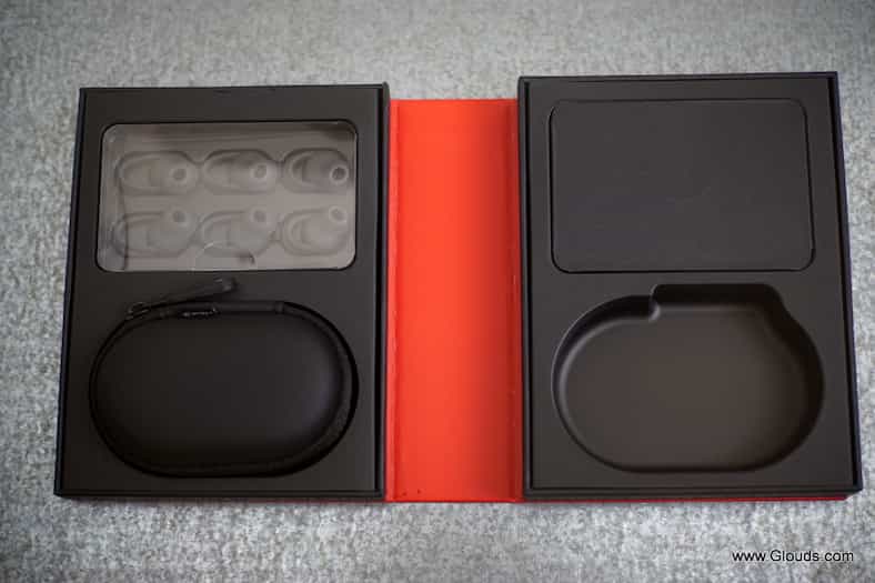 קופסא יפה ומעוצבת עם חלון יפה מאחור. פותחים והאריזה הפנימית האדומה נשלפת ונפתחת כמו ספר, שם מתגלות לנו האוזניות, סט מרשים של אטמים מסודרים כמו פרלינים בבונבוניירה יקרה וגם נרתיק איכותי וכבל טעינה נמצא כאן.