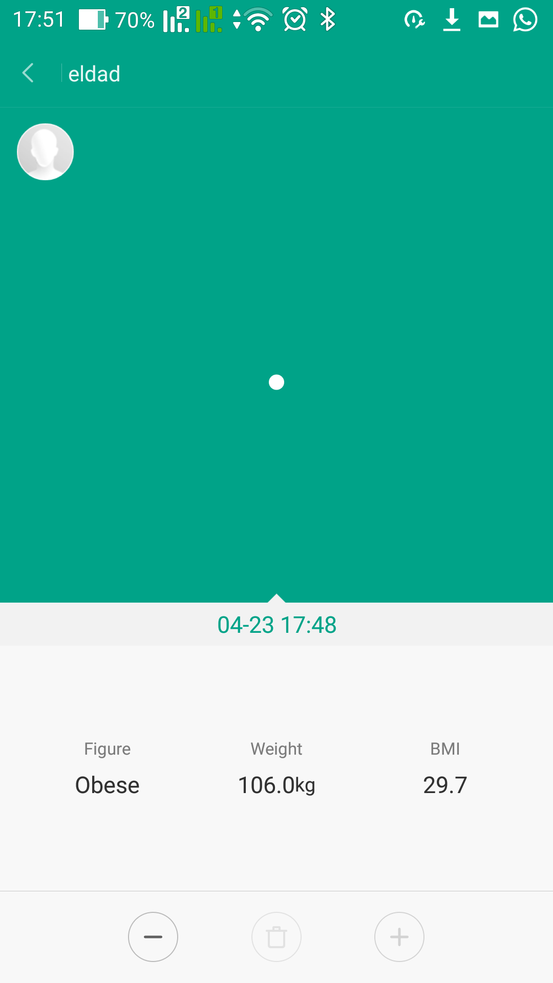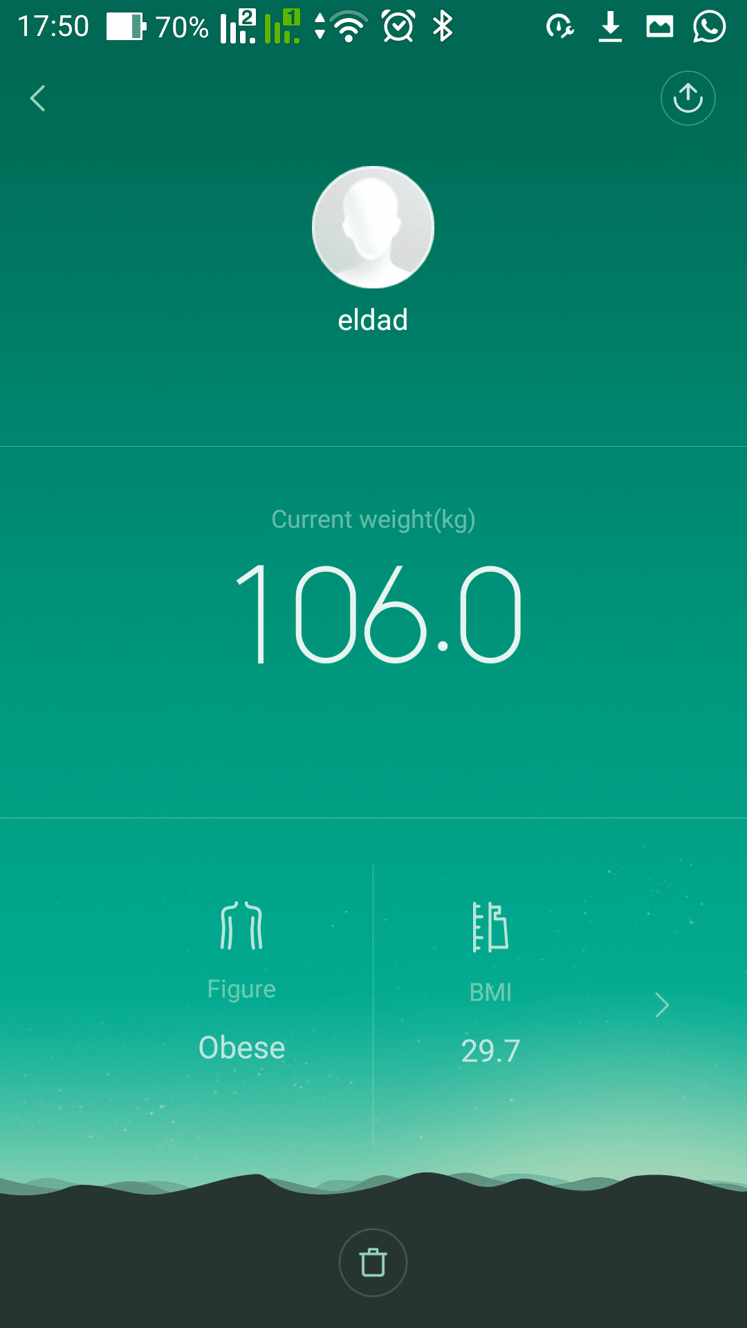 ההתרשמות הראשונית היא שהמוצר איכותי. המשקל עצמו נראה ומרגיש עמיד ומסיבי. כזה שיחזיק מעמד זמן רב. התצוגה ברורה וגדולה ולטעמי נראית מקצועית. ליד התוצאה של השקילה מופיעה תוצאה של מדידת טמפרטורת החדר. בין שקילות או בזמן אחסון המשקל נכנס למצב המתנה. מיד עם העליה על המשקל מתחילה המדידה והתצוגה על המכשיר מראה את המשקל. אם נמצא סלולרי בסביבה שמריץ את האפליקציה, התוצאה מוצגת מיד במכשיר. כדי לצלם את התמונה הזו החזקתי את הסלולרי ביד כשעליתי על המשקל. מתוצאת השקילה אתם יכולים לראות שיש לי סלולרי ממש ממש כבד.