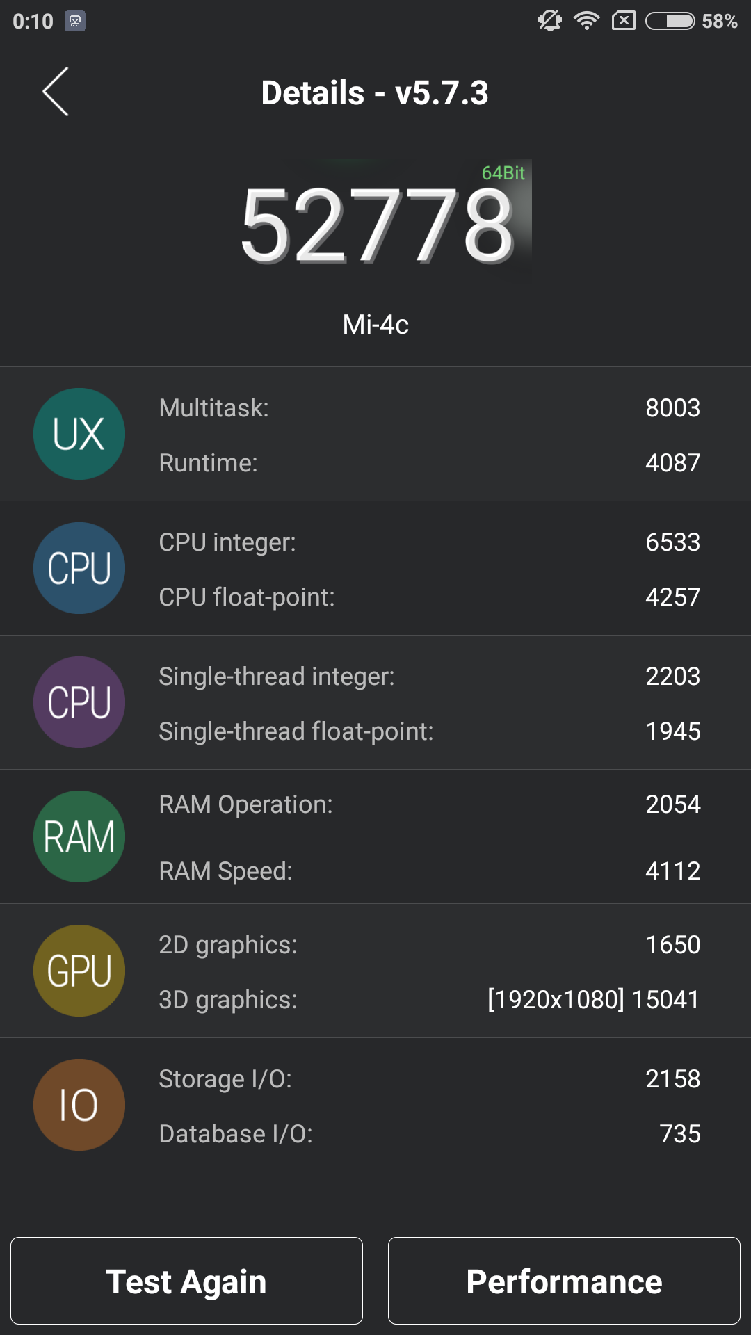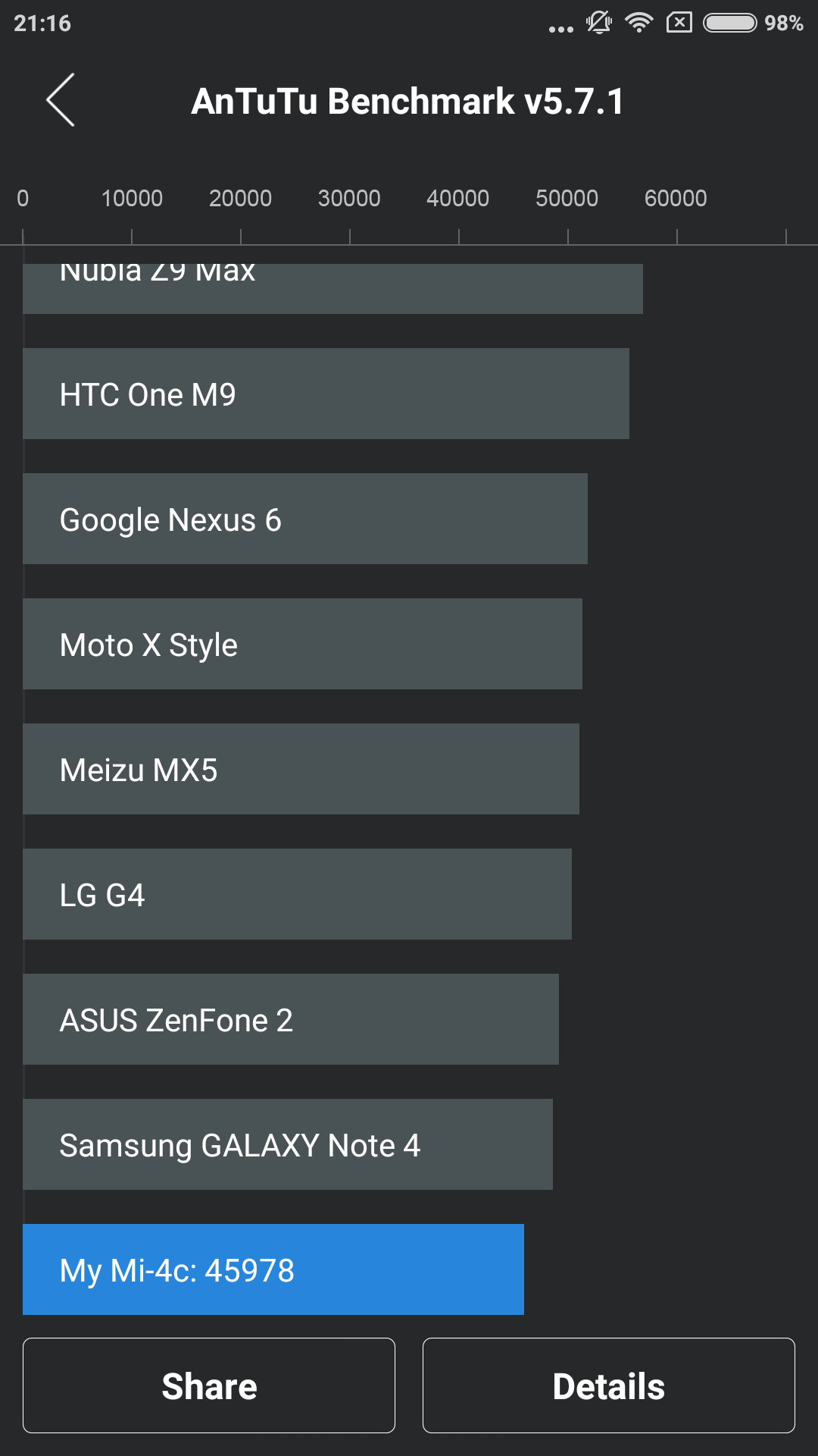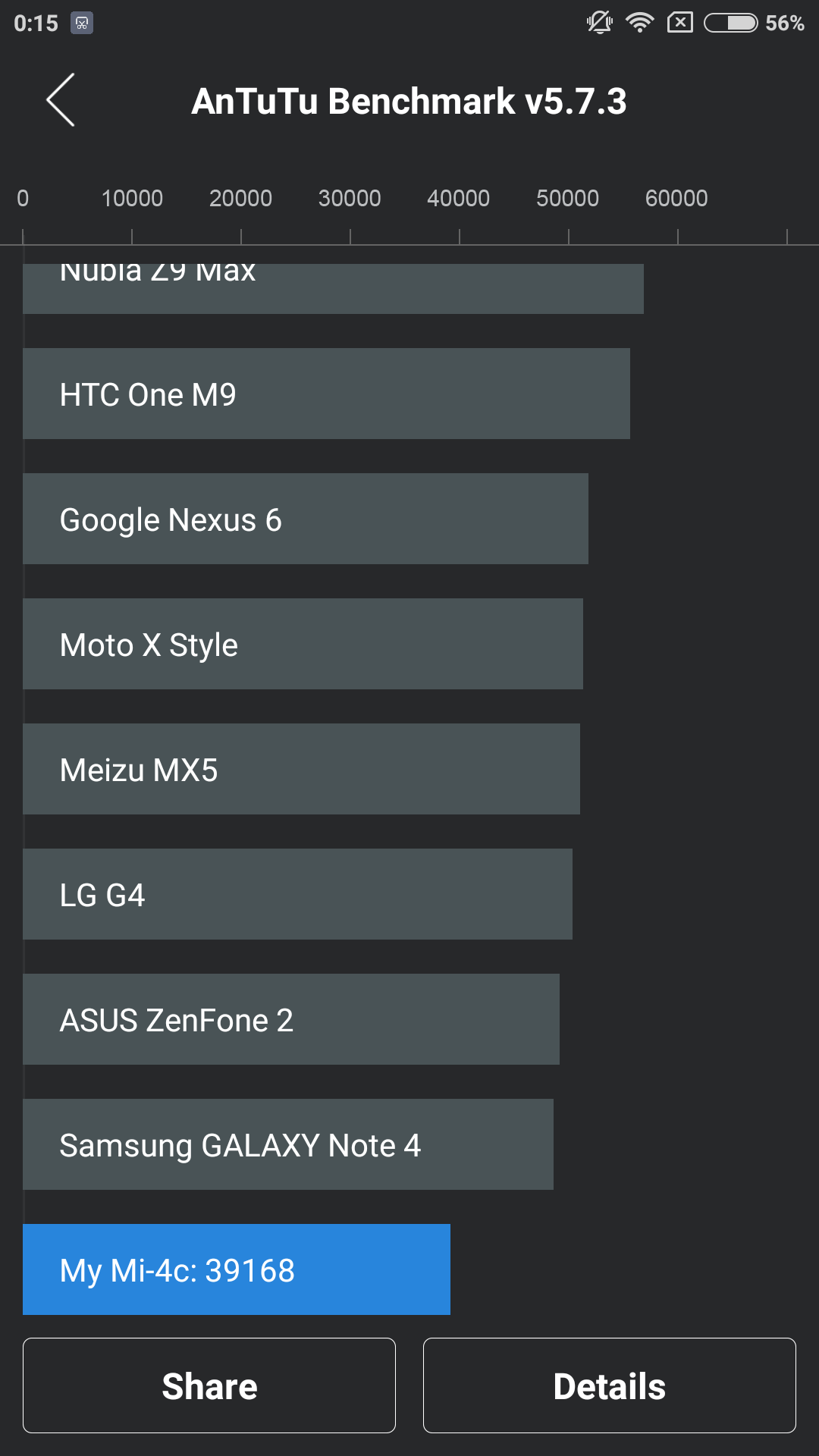 הרצתי עליו מגוון מבחנים סינטטיים, לכל אוהבי המספרים והציונים. הופתעתי לראות שהאנטוטו מעט נמוך מזה ששיאומי הבטיחו. במעבר למבחן אנטוטו 32BIT התוצאה עלתה, אך עדיין רחוקה בכמה אלפים מה 50+ ששיאומי טענו. בבחינה מדוקדקת של התוצאות בדפי השיווק של שיאומי, התברר שהם השתמשו בגרסאת אנטוטו חדשה יותר, 5.7.2 המסבירה את התוצאה השונה, ואכן, כאשר התקנתי ידנית את גרסאת האנטוטו החדשה ביותר, 5.7.3, התוצאה השתפרה פלאים ועלתה ל52,000 נקודות. זכרו גם שמדובר כאן בגרסא הבסיסית, עם 2GB ראם בלבד. אין ספק כי הגרסא הבכירה, עם 3GB ראם, תשיג תוצאה טובה עוד יותר.
