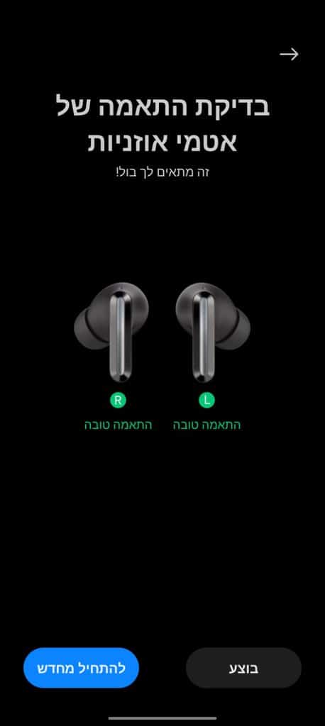 יש גם בדיקת התאמה של אטמי האוזניות ונזכיר כרגיל שאיכות הסאונד וסינון הרעשים באוזניות תוך-אוזן IEM שכאלו תלויה מאוד, אבל מאוד (!) בהתאמה לאוזניים שלכם אז קחו לכם רגע ותבדקו את גדלי האטמים המתאימים ביותר לכם. כל מרווח וחופש קטן יכול לשנות דרמטית את אופי ואיכות הסאונד וכמובן – את איכות סינון הרעשים.