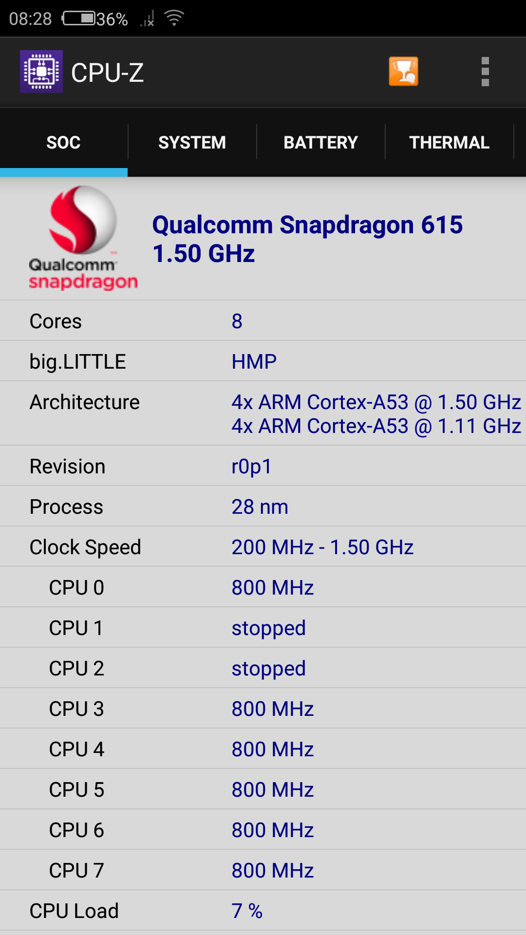 Qualcomm Snapdragon 615, 64bit, 1.5GHz Cortex A53 quad core+ 1.0GHz Cortex A53 quad core; |