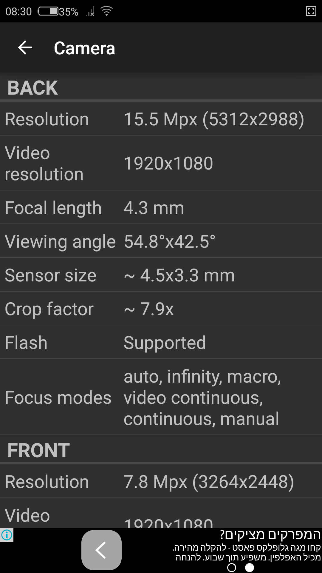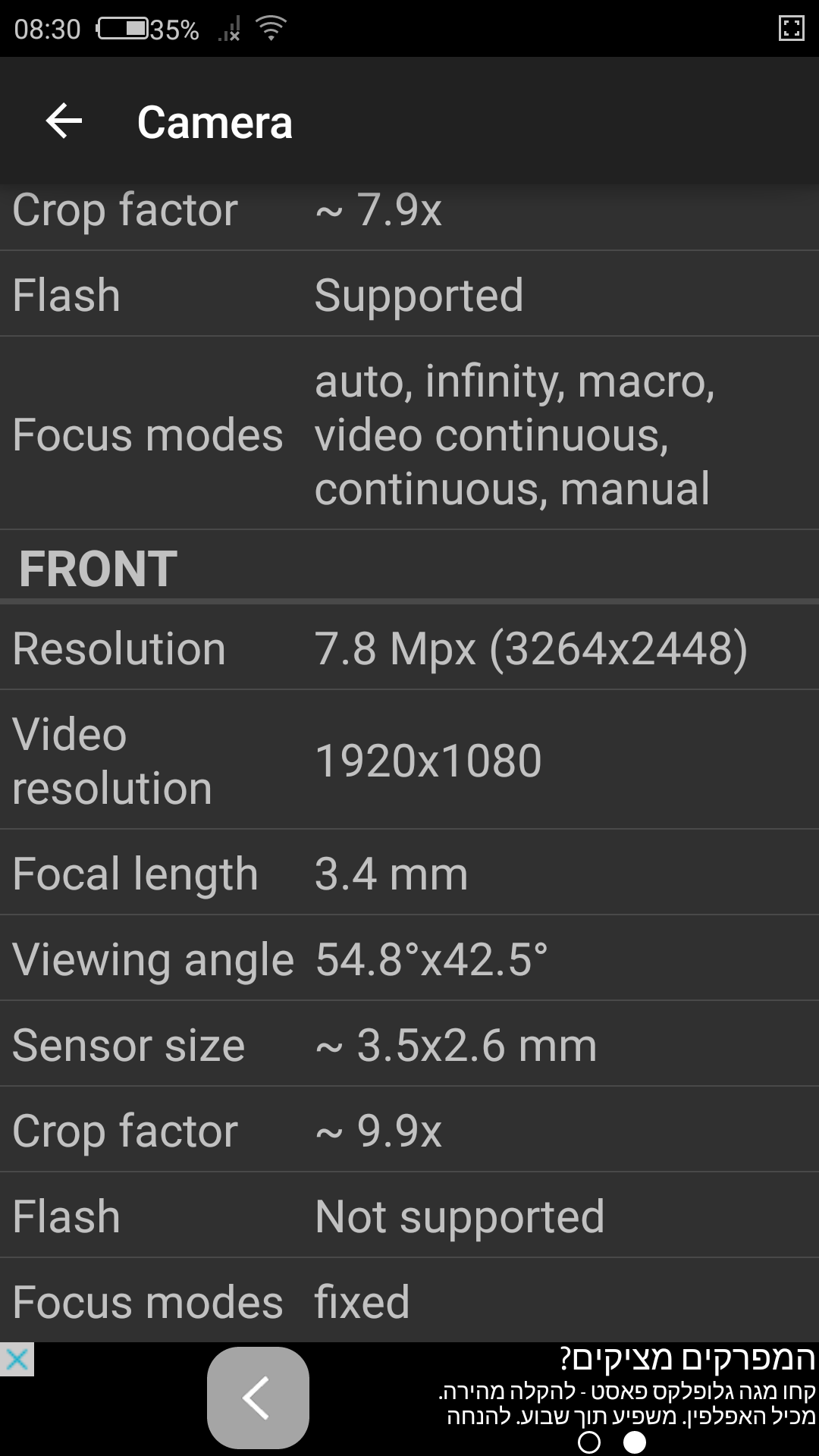 | GPU | Adreno 405 | מצלמה קדמית | 8 מגה פיקסל |