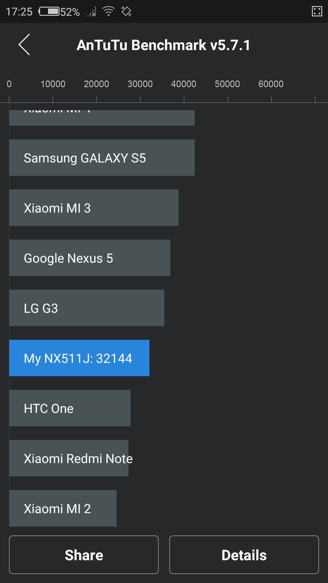 כמו כל סדרת ה NUBIA, המסך הוא לא פחות ממצוין. רזולוציית FHD טובה וחדה, במסך קטן יחסית, נראית פשוט מצוין. בהגדרות ישנה אפשרות לכוונון טמפרטורות ורוויה, ובהשוואה צד לצד לגלקסי 5 (מסך AMOLED בעל תכונות שונות מאוד מ- LCD), הביצועים הם סה"כ שווים הן באיכות התמונה והן בבהירות, עם יתרון מסויים לגלקסי בעוצמת הבהירות המירבית (אם כי פחות דרמטי מכפי שנראה כאן בתמונות)
