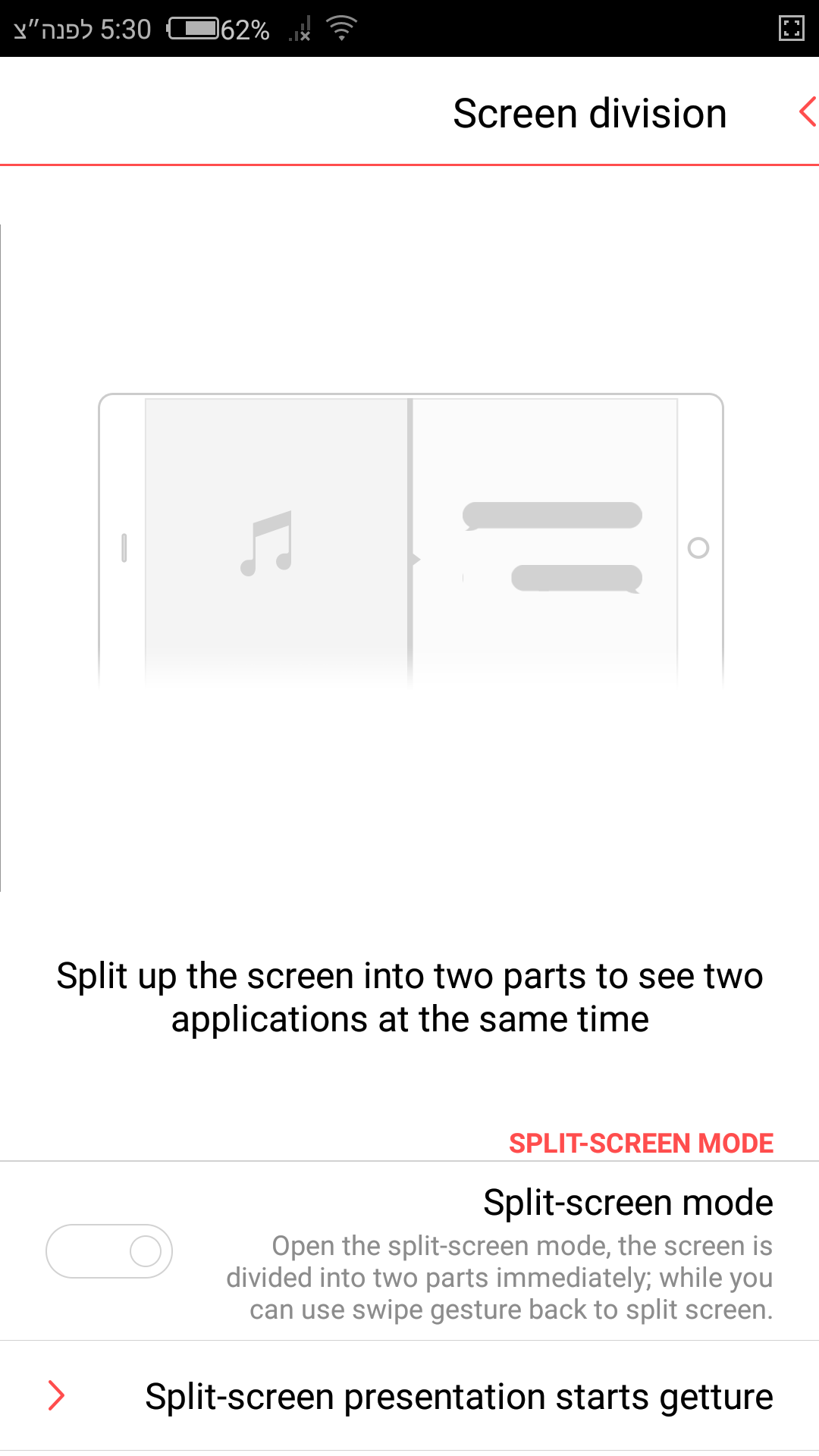פיצ'ר ייחודי כאן הוא מסך מפוצל, המאפשר לפצל את המסך לשני חלקים, ולהפעיל על כל צד אפליקציה שונה, למיקסום המולטיטאסקינג ושכלול הפרעות קשב… רעיון נחמד, שנראה אף שימושי יותר מהFLOATING SCREEN של סמסונג, מאחר והוא ממש 'מחלק' את המכשיר לשני מכשירים נפרדים לכאורה, כך שניתן להריץ כל אפליקיה שנבחר באחד מחלקי המסך, ולא רק אפליקציות מותאמות כגון נגני וידאו או יוטיוב (כפי שמיושם בסמסונג), אך לטעמי חסר תועלת במסך כה קטן.