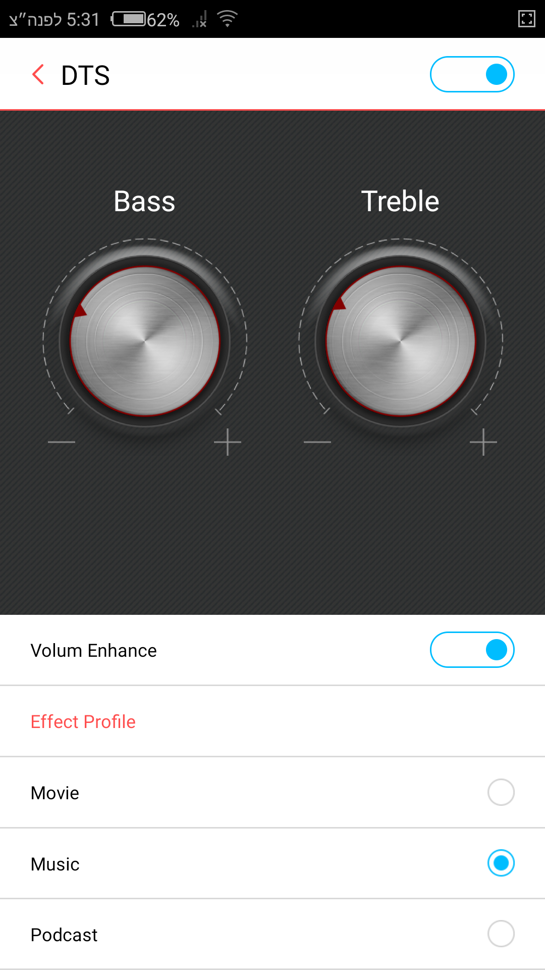 בהגדרות נמצא גם תמיכה בדולבי DTS הפעיל רק בחיבור לאוזניות.
